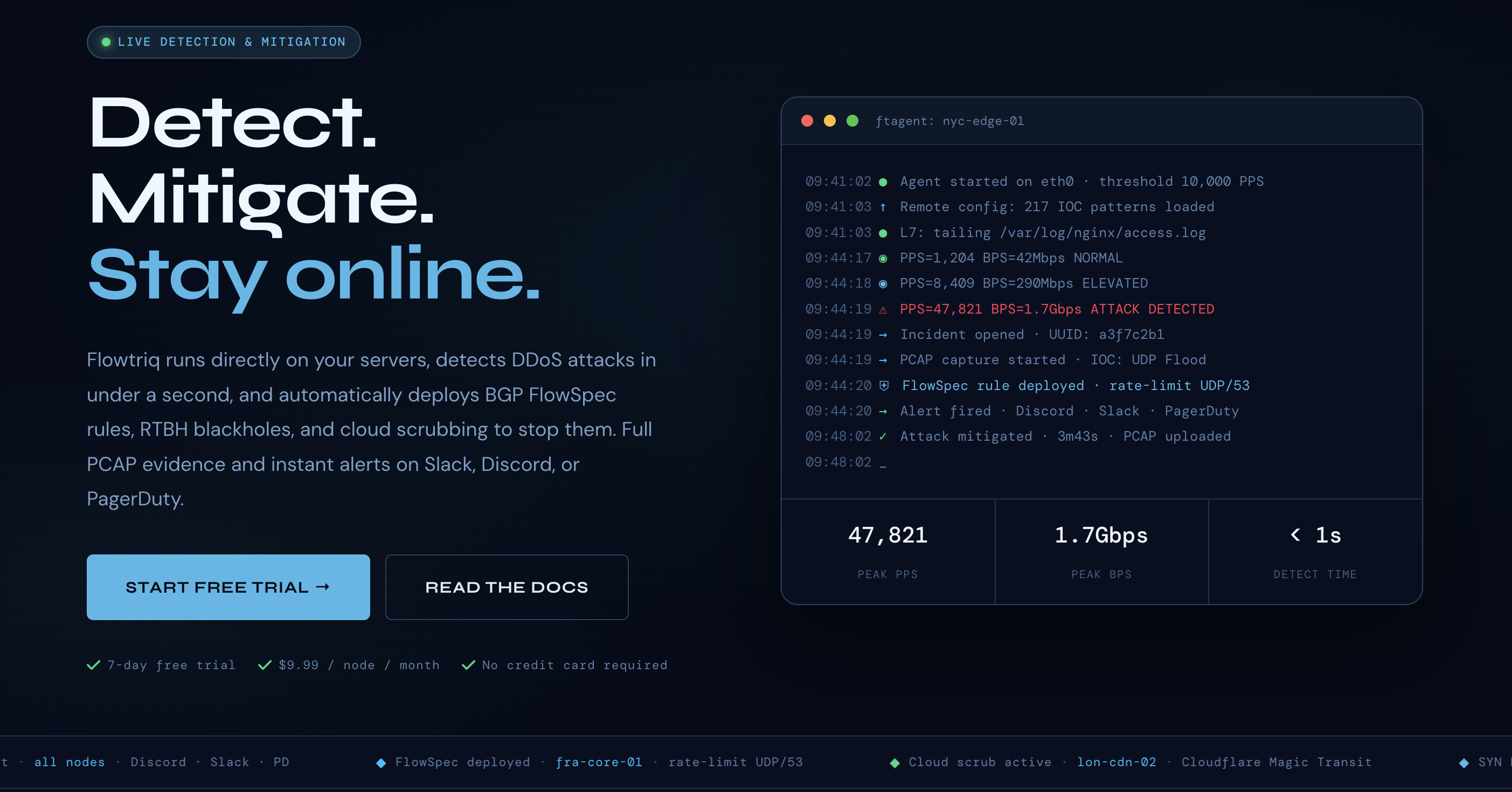 Imagine this: Your startup's website is humming along, processing orders and delighting users, when suddenly, a barrage of malicious traffic crashes your servers. Downtime ensues, customers flee, and revenue evaporates—all while you're scrambling to diagnose the attack. This frustration is all too real for startups in e-commerce, fintech, and SaaS, where DDoS attacks can strike without warning, costing an average of $120,000 per hour in lost business, according to recent cybersecurity reports. Enter Flowtriq, a real-time DDoS detection and auto-mitigation platform that tackles these threats head-on. By installing a lightweight agent on your servers, it detects anomalies in under a second and responds automatically, minimizing disruptions. Compared to traditional tools like Cloudflare or Akamai, which often require complex setups and higher costs, Flowtriq offers sub-second mitigation with adaptive learning—no tedious threshold tuning needed. This makes it a practical, data-driven choice for resource-strapped founders, focusing on empirical speed and efficacy to keep your operations running smoothly (100 words).